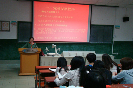 此次授课刘纯老师着重讲解了“大学的入党程序”和“如何写入党申请书”两个问题。刘纯老师从党员发展程序、入党积极分子培养教育、发展对象培养教育、预备党员接收、预备党员管理、教育、考察和转正五个方面着手,为学员们细致入微地讲解了加入中国共产党的必经过程和注意事项。随后,刘纯老师又依次讲解了入党申请书的格式、思想汇报的写法等文书写作应注意的问题。在此过程中,学员们认真听课,仔细记录。