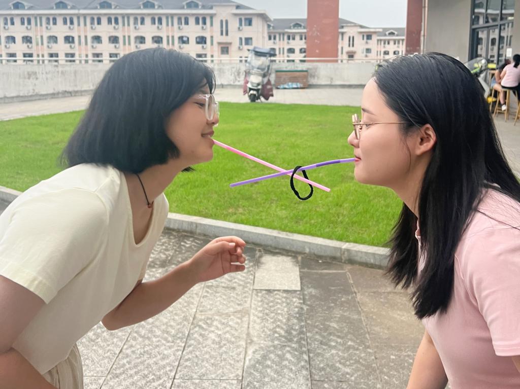 这个游戏考验团队协作能力,第一个人把吸管上的饰物顺次放到第二个人的吸管上,以传递速度决定胜负。