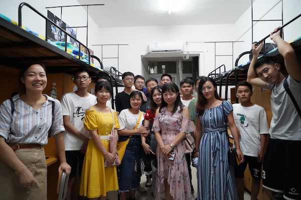 走访过程中,院领导、老师与新生家长们就宿舍条件、适应情况、困难问题等进行交流沟通。在注意到大多寝室都紧闭门窗时,院领导和老师们提醒新生夏季炎热,开空调纳凉的同时更要注意通风问题,同时也提醒同学们湖南气候非常湿润,天气多变,要注意身体健康,有任何不适要及时就医,鼓励同学们在以后的学习中多与老师沟通联系,要对未来的学习生活有信心、有恒心、有毅力!在与家长聊到孩子的适应性和依赖性问题时,领导、老师们耐心开导家长,鼓励家长们放宽心,让孩子多独立,从而学会独立。李院长表示,学校持续关心同学们的诉求和需要,近几年一直不间断地针对生活条件进行着改善与革新,今年上半年,学校基本实现了空调全覆盖,“洋气”的南苑师生餐厅为同学们打造了又一处美食坐标,满足同学们不同的饮食习惯,希望同学们要珍惜继续读书深造的机会,努力学习增长本领,为把自己锻造为国之栋梁、为实现伟大的中国梦而聚力。此外赵书记在与学生家长的交谈时,亲切地关心他们前来报道的出行方式和家长住宿安排,赵书记非常感谢家长朋友们把孩子送到湘大、送到文新院来,同时也表示老师们一定会关心好、教导好、培育好孩子,请家长朋友们放心。