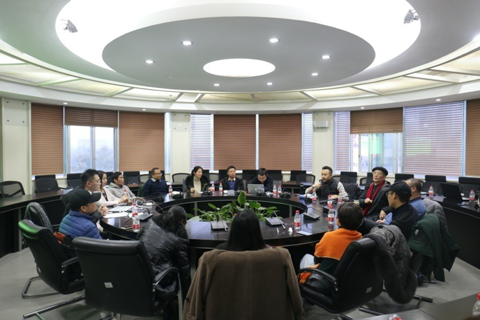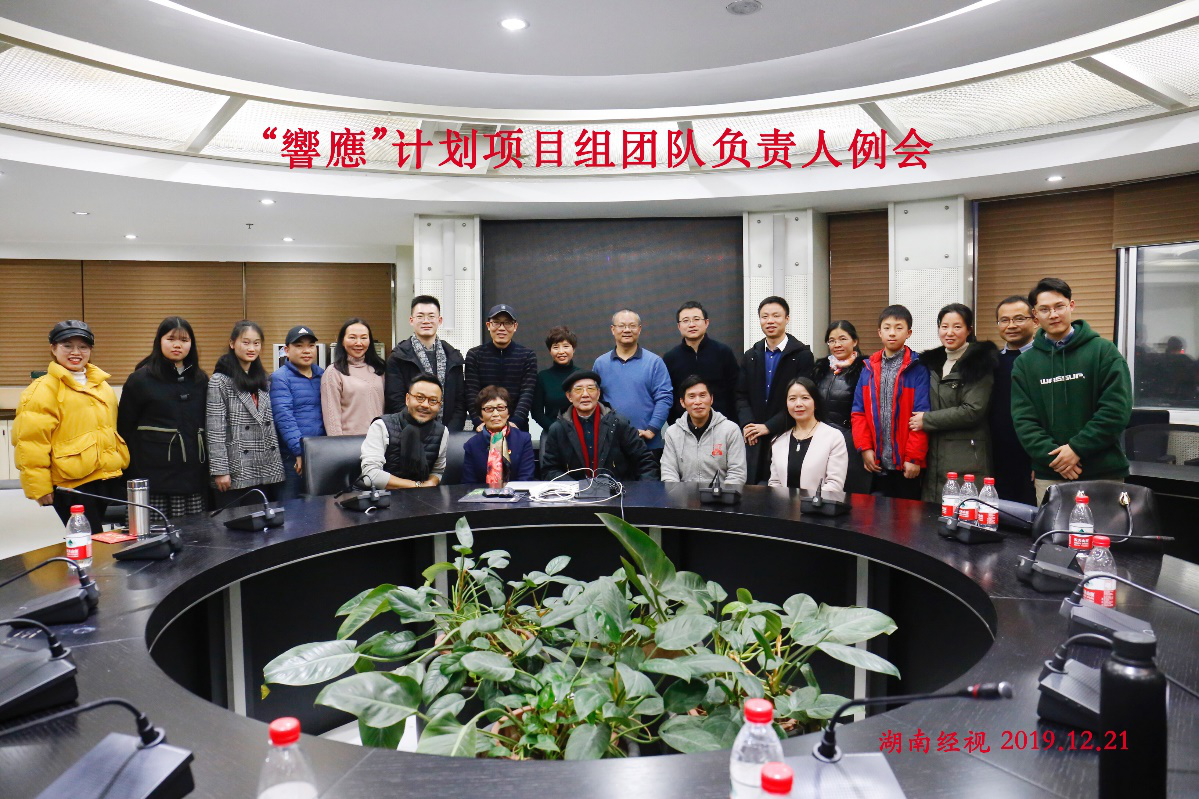教授陈山青在湖南经视圆形会议室组织召开2019年度“響應”计划项目组团队负责人例会,参加会议的主要成员还有湖南师范大学鲍厚星教授,湖南卫视著名节目主持人、“響應”计划发起资助人、中国语言资源保护研究中心顾问汪涵先生,“響應”计划总负责人陈立中教授,团队负责人彭泽润教授、彭建国教授、张栋教授,以及我院研究生裴英豪等。