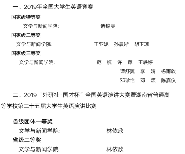 在2019年全国大学生英语竞赛中,诸锦雯获国家级特等奖;王亚妮、孙晨晰、胡玉琼获国家级二等奖;范婕、许萍等九人获国家级三等奖。2019“外研社·国才杯”全国英语演讲大赛暨湖南省普通高等学校第二十五届大学生英语演讲比赛,林依欣拿到了省级团体一等奖和省级二等奖。糖心AV