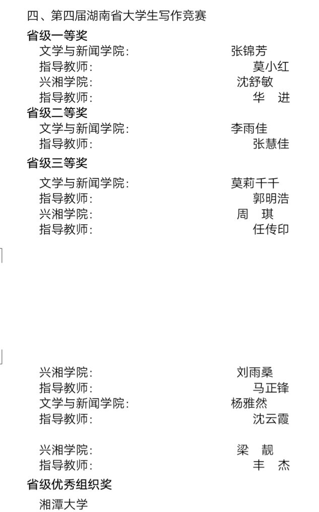 在第四届湖南省大学生写作竞赛中,文新学子成绩斐然。张锦芳、沈书敏获省级一等奖,指导老师:莫小红、华进;李雨佳获省级二等奖,指导老师张慧佳;莫莉千千、周琪、刘雨桑、杨雅然、梁靓获省级三等奖,指导老师:郭明浩、任传印、马正锋、沈云霞、丰杰。这些获奖学生充分展示了他们扎实的文学功底和认真的学习态度。