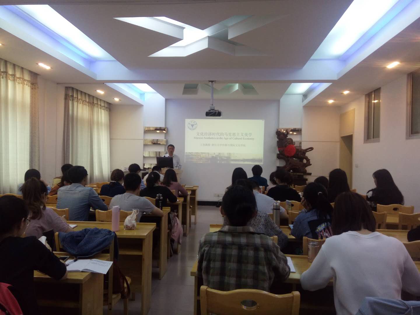 2018年4月27日下午3时,在文科楼318学术报告厅,浙江大学求是特聘教授/博士生导师、教育部“长江学者”特聘教授、中华美学学会副会长、中国艺术人类学会副会长、英国曼彻斯特大学名誉研究员、国家教材委员会专家委员会委员、国家出版基金评审委员王杰教授为我院师生带来了一场题为“文化经济时代的马克思主义美学”的精彩学术讲座。本次讲座由我院博士生导师李志雄老师主持,我院部分教师、博硕研究生及其他糖心AV