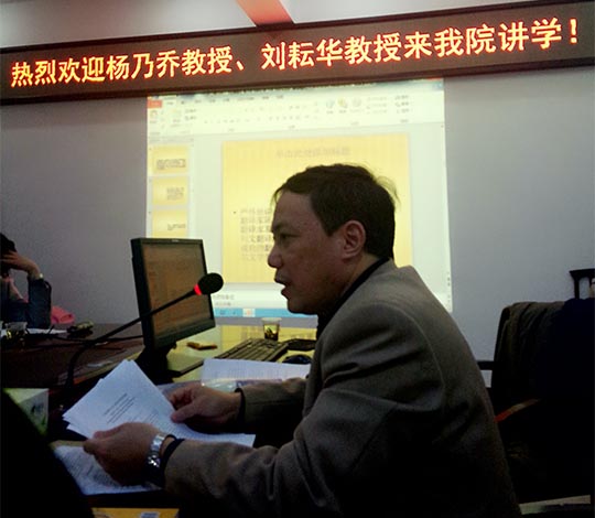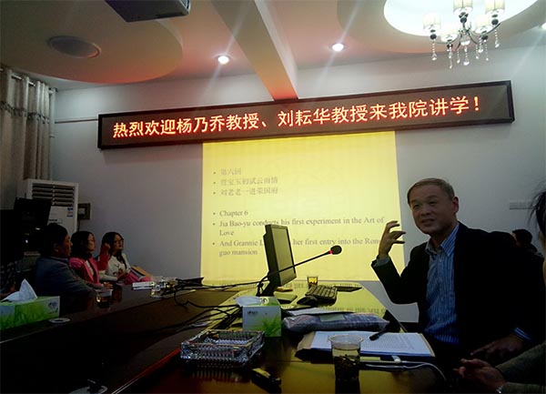2015年10月30日下午,应我院邀请,复旦大学比较文学与世界文学学科负责人杨乃乔教授、上海师范大学比较文学与世界文学国家重点学科负责人刘耘华教授在文科楼317会议室为我院师生做比较文学学术讲座,题目分别是“红楼梦与The story of the stone——谈异质文化观念的不可通约性极其翻译的原创性”、“文化原创期与中西之源发性差异的形成——视域岐分视角下的中西文学比较”。讲座由季水河教授主持,何云波教授、王洁群教授、童真教授、王建香教授、熊毅副教授、罗如春副教授、王芳副教授、刘中望副教授等10余位老师和60余名博士生、研究生参加了此次讲座。