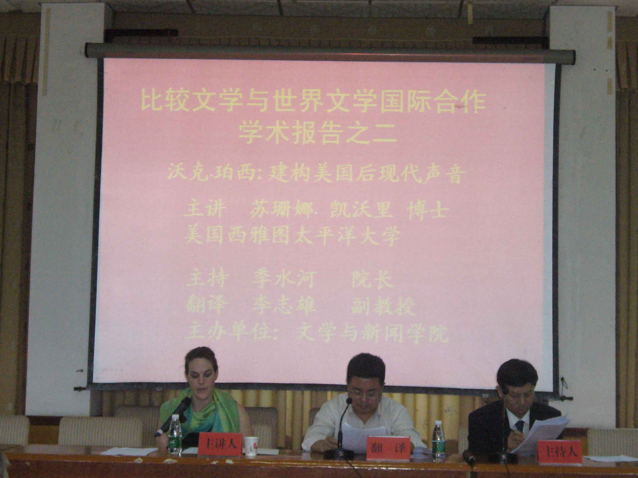 瑞贝拉博士以西方源头性文化为宏观背景,在共同的人文主义立场上,就马克思主义与基督教两种不同的人文思想进行了历史性的阐释,主张在全球化的语境下,人文主义思想之间应该开展积极对话,为文化的交流融合作贡献。苏珊娜博士以第三空间为主题,探讨了美国后现代文学语境下“声音丧失”与“自我寻找”等重要问题,蕴含深刻的哲学启示和展现出迫切的现实意义。期间,中美双方还互赠了礼物,美国方面带来了校徽、有其学校标志的文化衫以及介绍华盛顿州和西雅图太平洋大学的书籍,中方将季水河教授的新作《回顾与前瞻——论新中国马克思主义文艺理论研究及其未来走向》作为礼物赠送给外宾并请他们转存一本于西雅图太平洋大学图书馆,该著作曾获中国国家社会科学基金项目优秀成果奖。