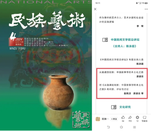 漆凌云教授在《民族艺术》(校定二类)2024年第4期发表题为《从融通到创新:中国故事学的本土化之路》的学术论文。