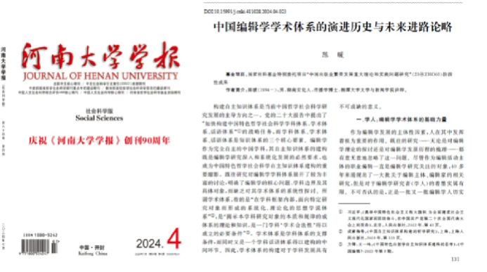 教师陈暖博士在《河南大学学报(社会科学版)》(CSSCI)2024年第4期发表题为《中国编辑学学术体系的演进历史与未来进路论略》的学术论文。