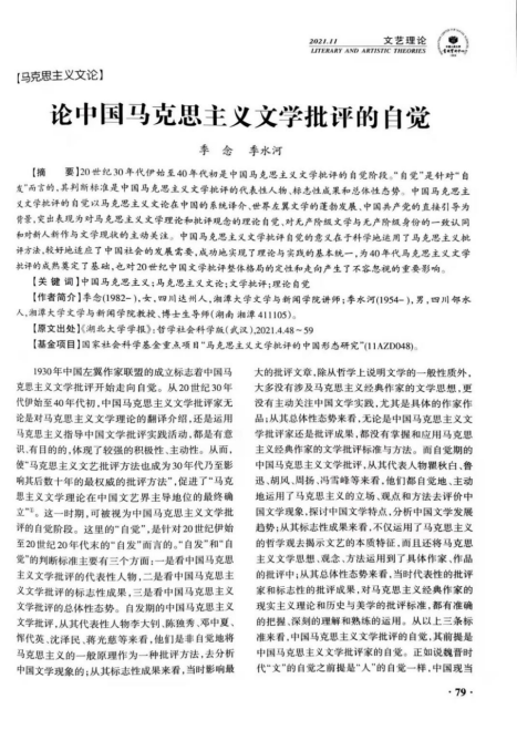 我院比较文学与世界文学专业教师季念博士和季水河教授合著的论文《论中国马克思主义文学批评的自觉》(原发于《湖北大学学报》2021年第4期 )被人大复印资料《文艺理论》(校定二类期刊)2021年第11期全文转载