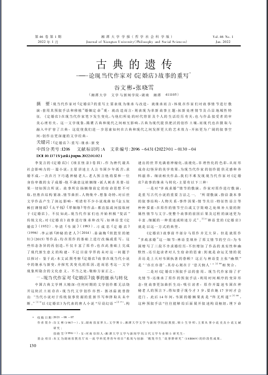 谷文彬副教授论文《古典的遗传——论现当代作家对<定婚店>故事的重写》刊发CSSCI期刊《糖心AV 学报》