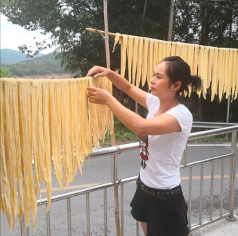 挑豆笋是个技术活,从沸腾的豆浆中挑豆笋,靠的是手感和经验。用单根筷子轻轻从边边划过,然后用食指、中指、大拇指快速抽起。挑—抽—挂—晾,一条条竹笋就拎出来了。怎么不烫?刚开始做的时候手指烫着受不了,挑习惯了,这三根手指也变得硬实了。